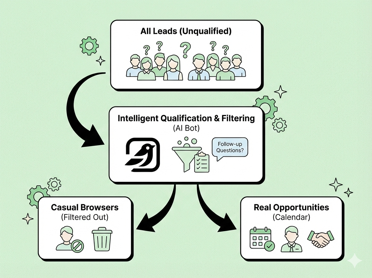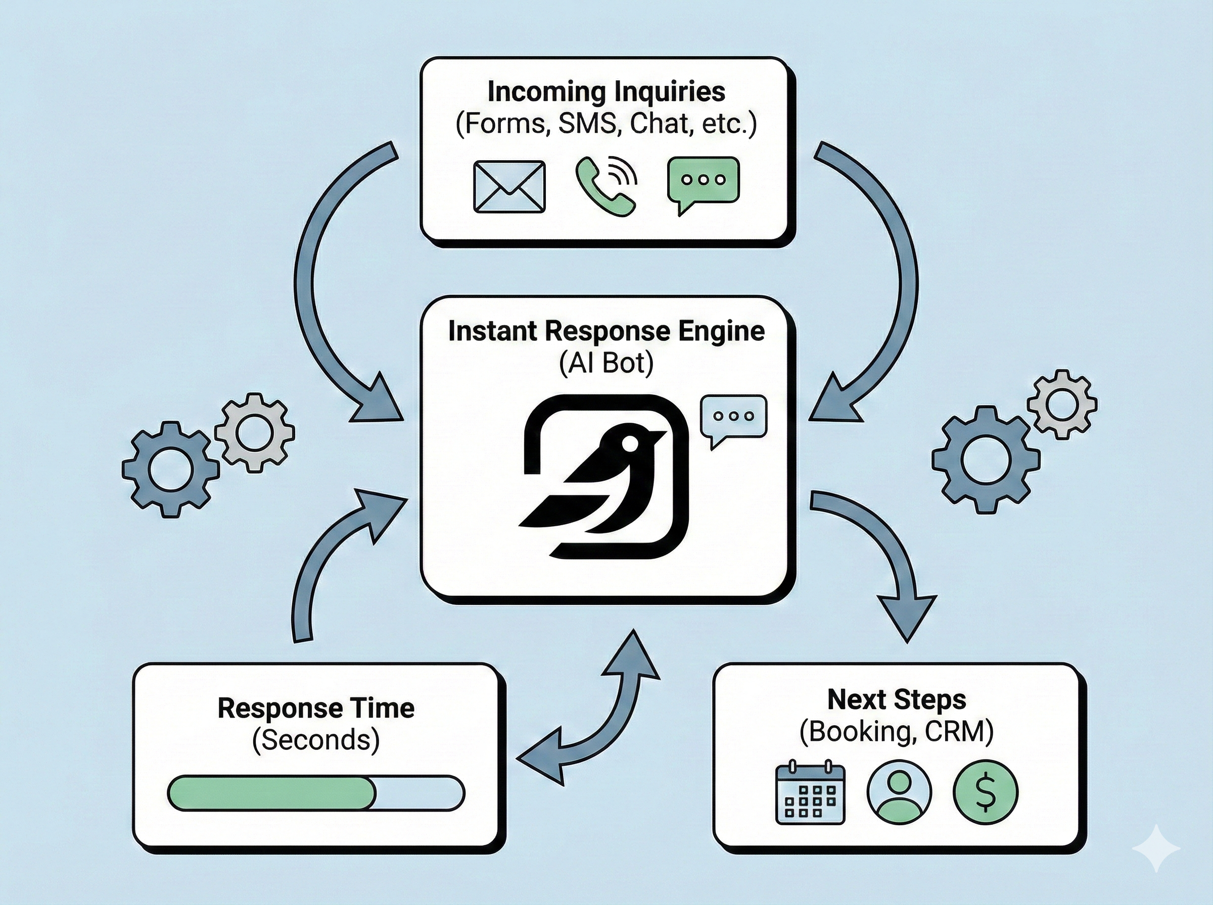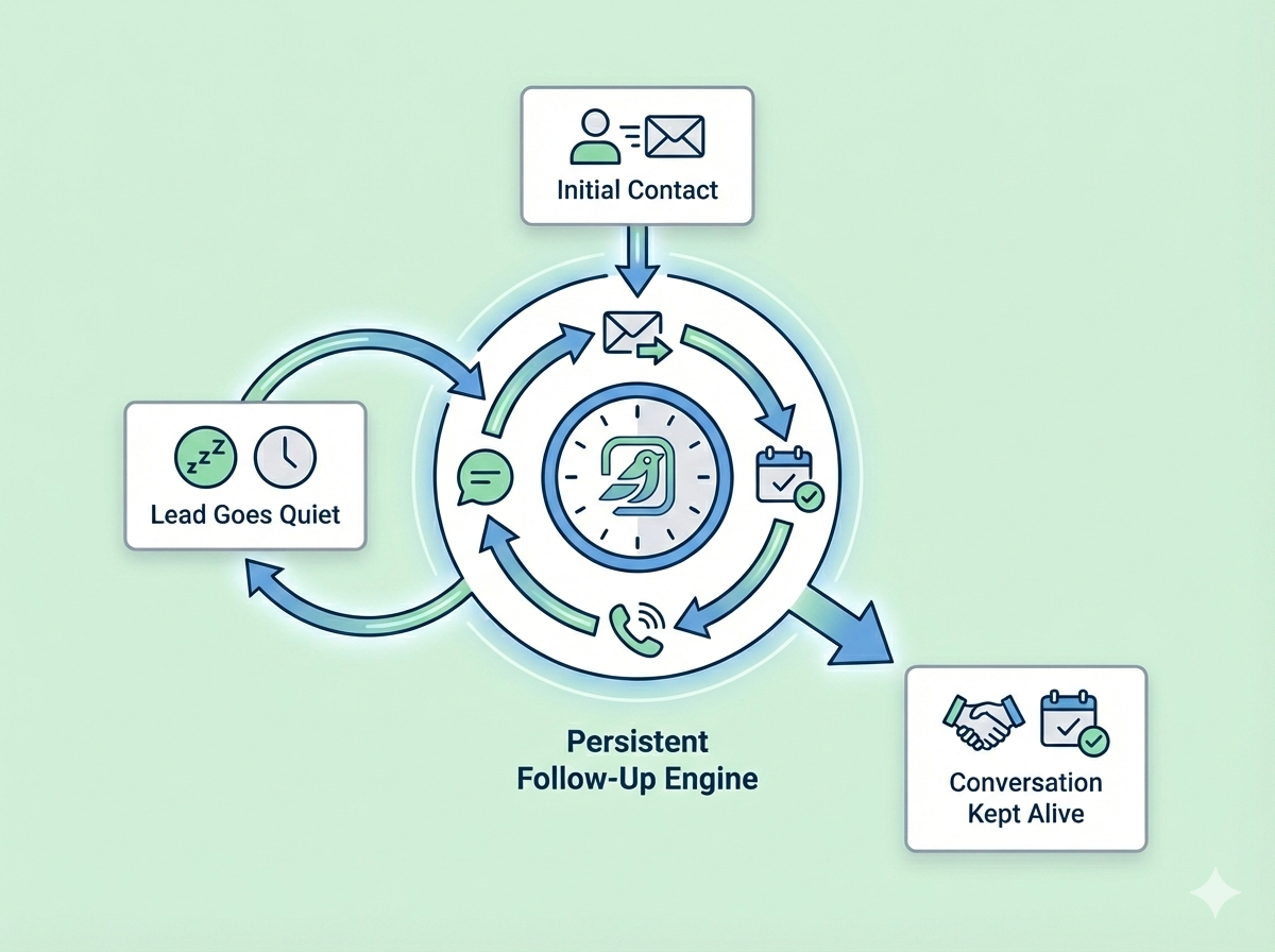 The moment an inquiry comes in - ads, web forms, SMS, social DMs, live chat, Whatsapp - it responds within seconds so prospects aren’t left waiting (or buying elsewhere).